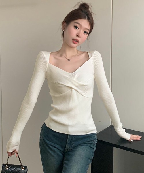 トップス《ツイストVネックリブニットトップス 全3色》