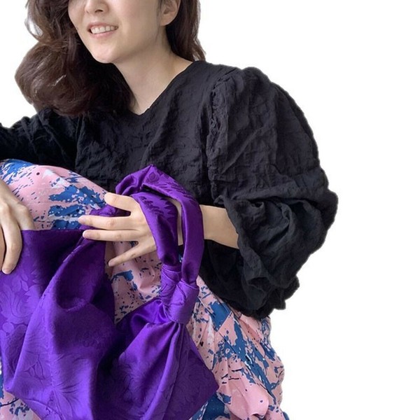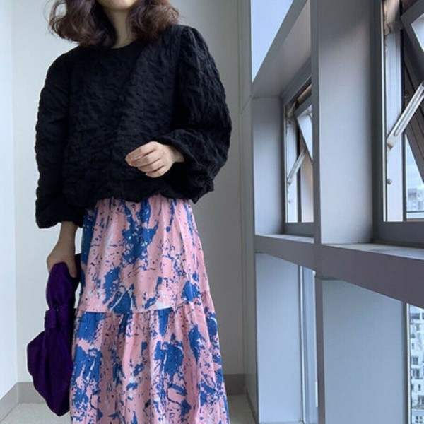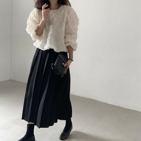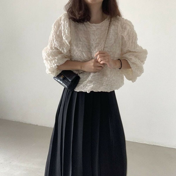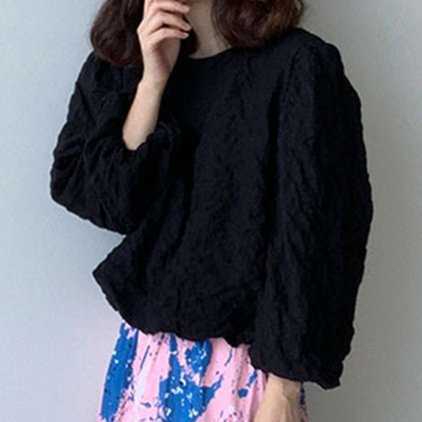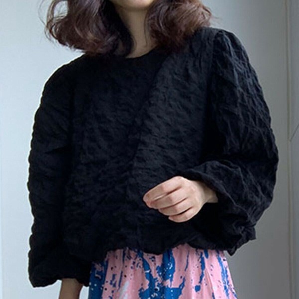 ワッフル風変わり織プルオーバーブラウス/袖口ゴム/ボリューム袖