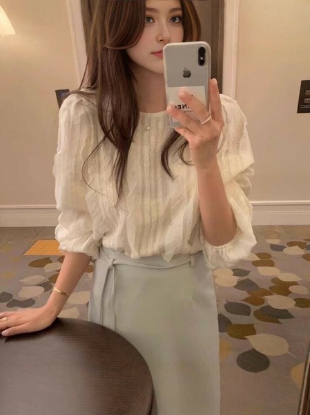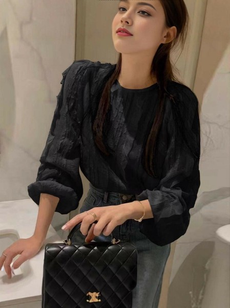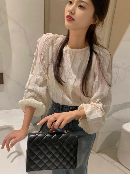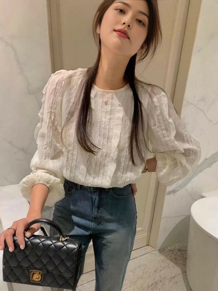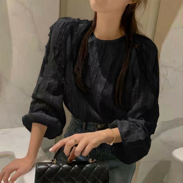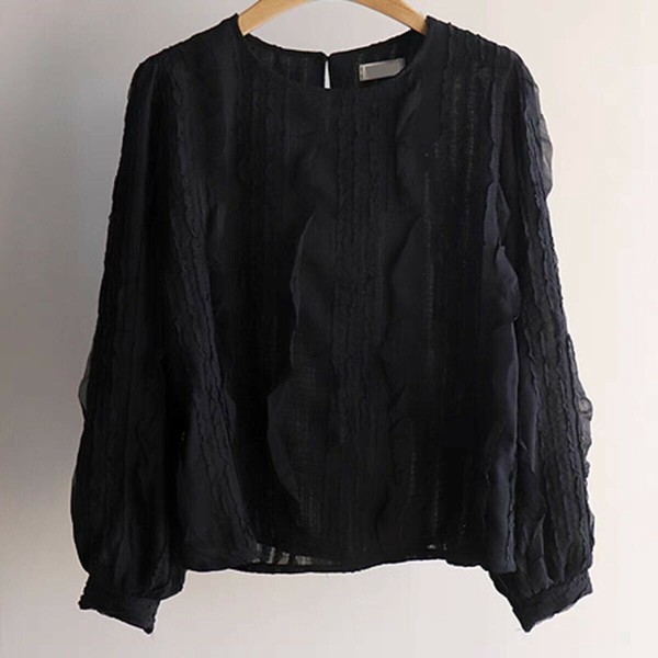 フリル織柄ブラウス/ボリューム袖/袖口ゴム
