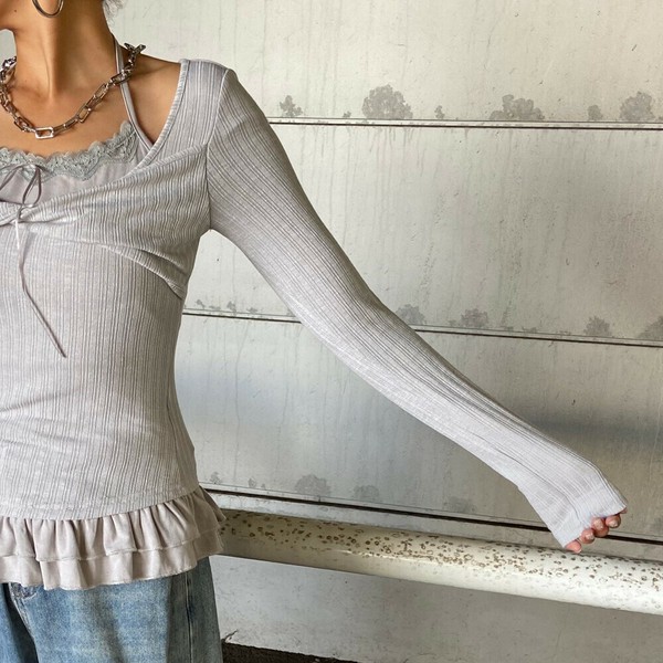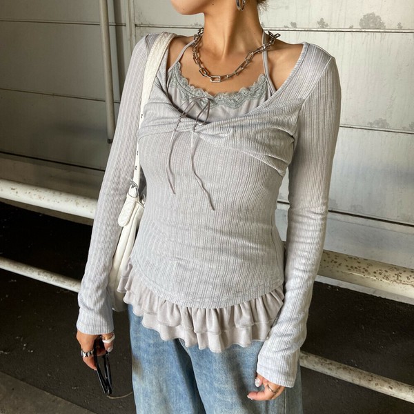 【2025新作】フロントカシュクールアンサンブル風トップス レイヤードトップス レースキャミ 秋服