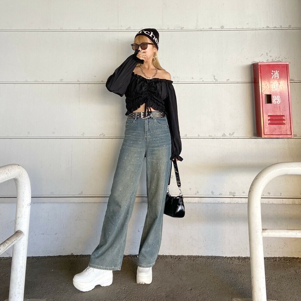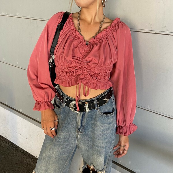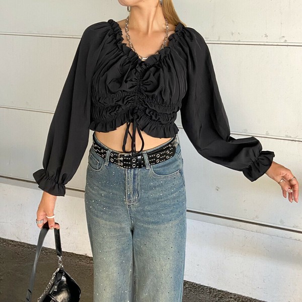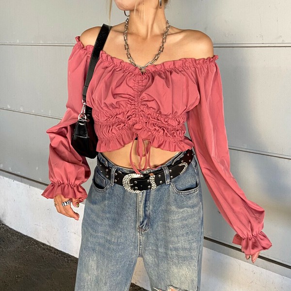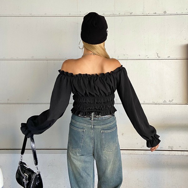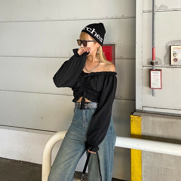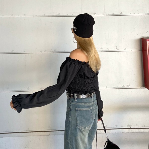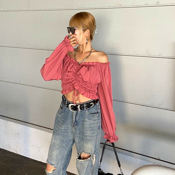 【2025新作】フロントドロストプルオーバー オフショルダー ギャザー シャーリング 秋服