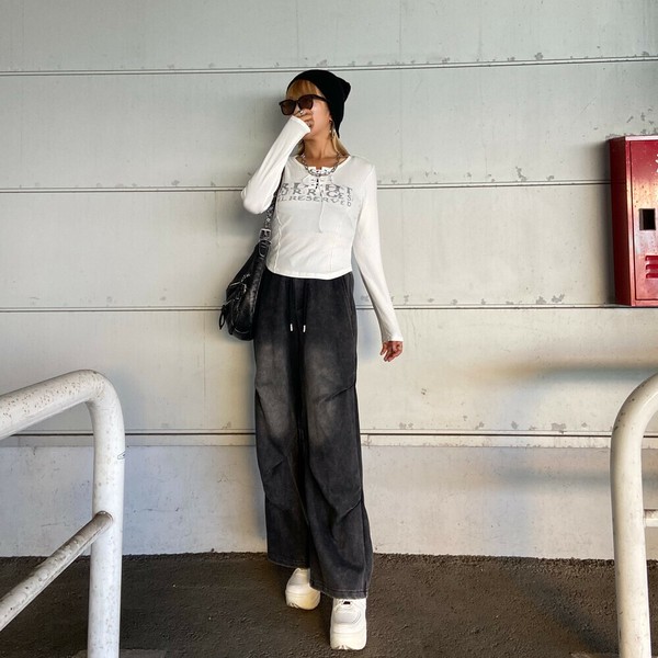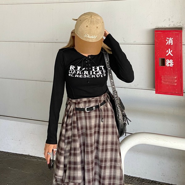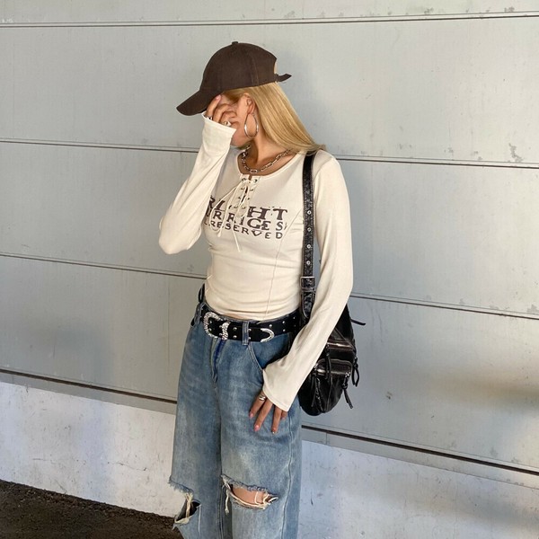 【2025新作】ロゴレースアップTシャツ スピンドル ペイントロゴ リブ レタリング 長袖 秋服