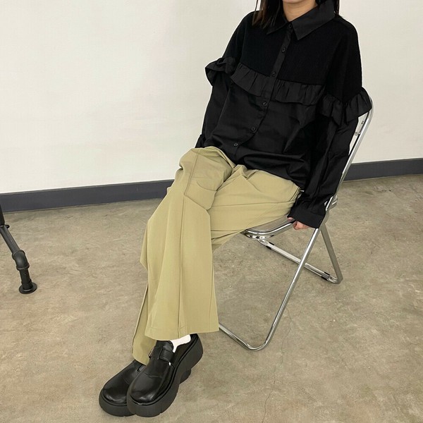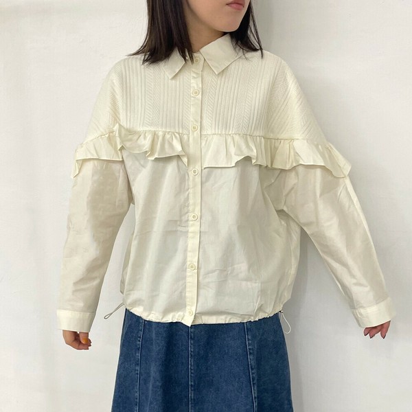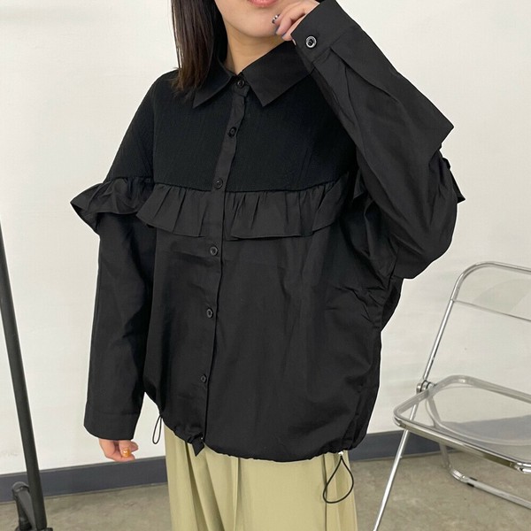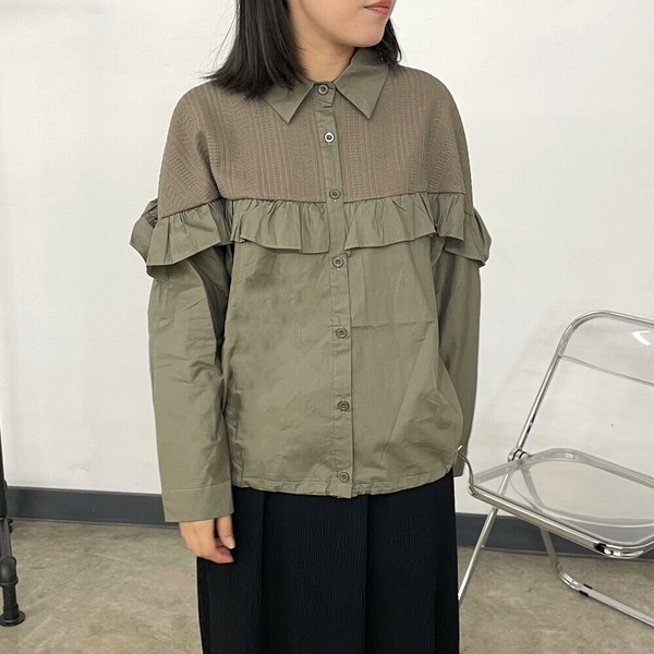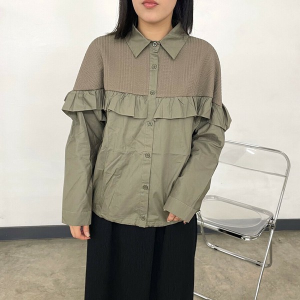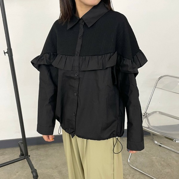 【2025新作】ケーブル切替フリルシャツ ブラウス 異素材 デザイントップス 無地 秋服 冬服