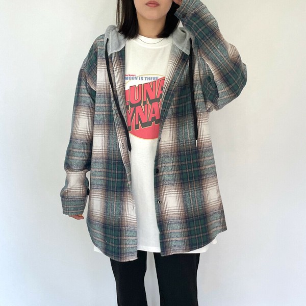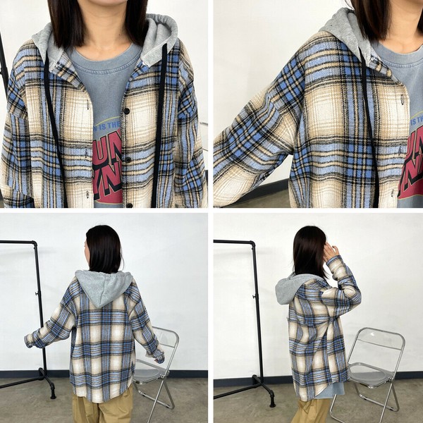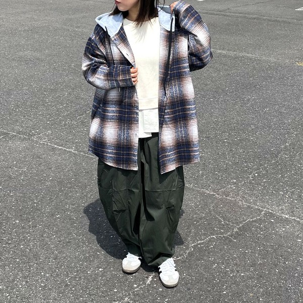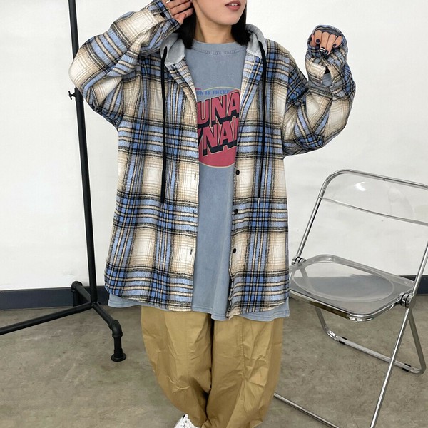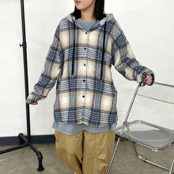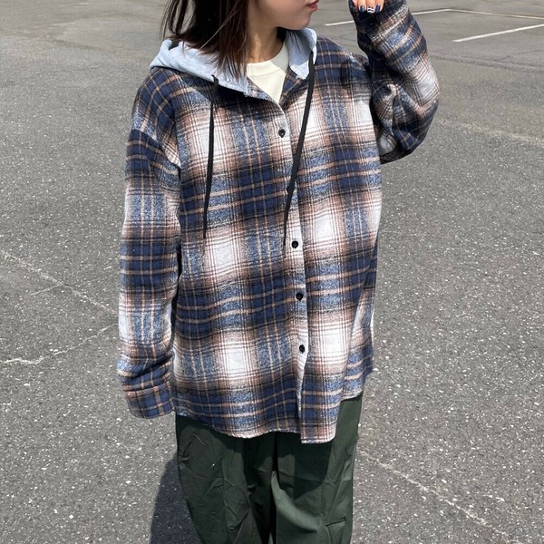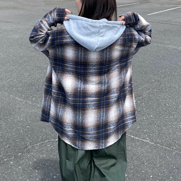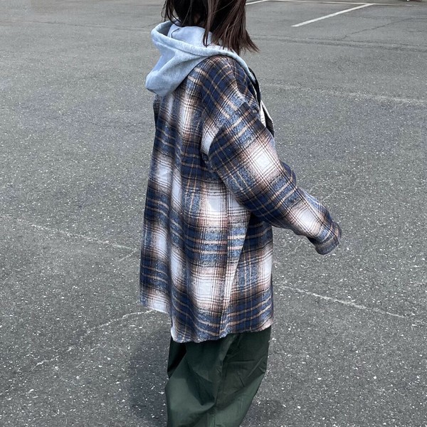 【2025新作】フードチェックシャツ 長袖 ワイド ゆったり 裏起毛 もこもこ ネル 秋冬