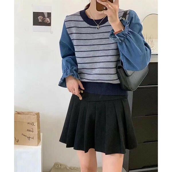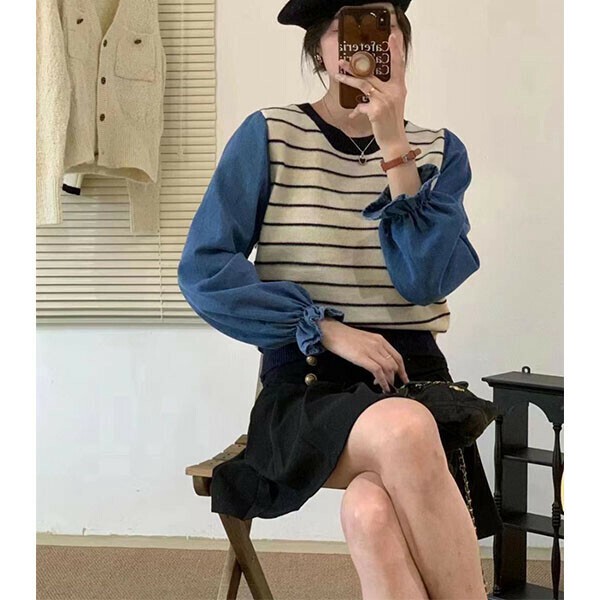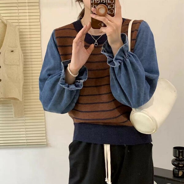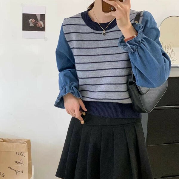 ボーダーニットxフリルデニム袖・カーディガン/セーター