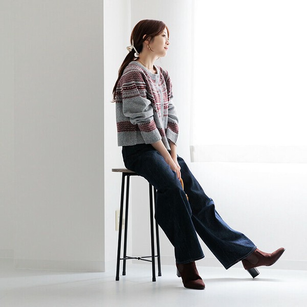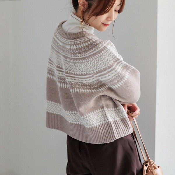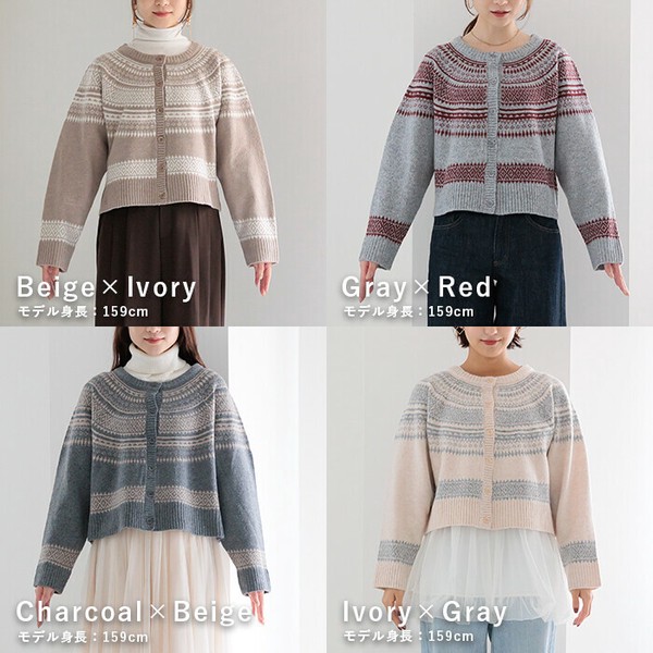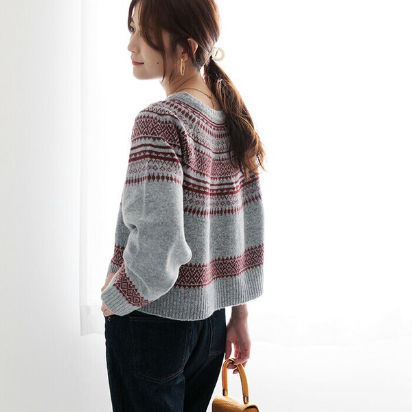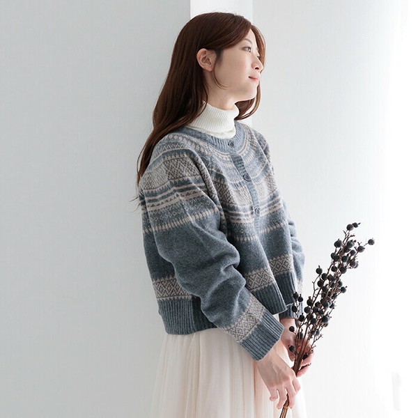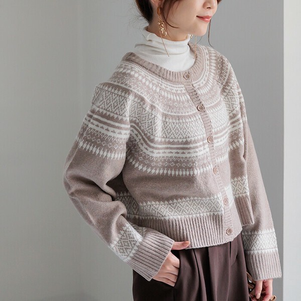 ニットカーディガン レディース トップス ノルディック柄ニットカーディガン クルーネック 長袖 25515