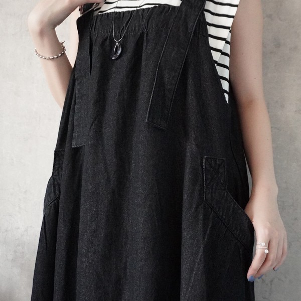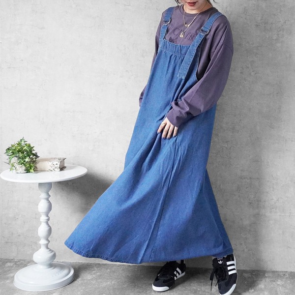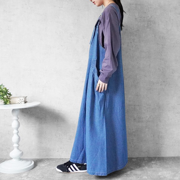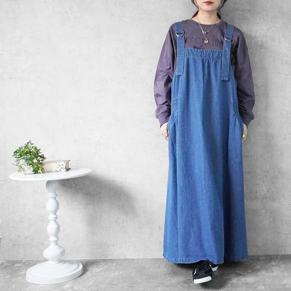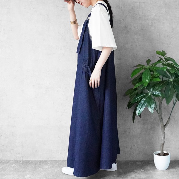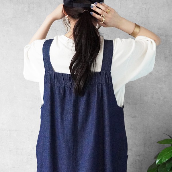 サイズ・容量サイズ(単位:約cm)【S/M/L/LL】総丈【126/127/128.5/129.5】バスト【117/120/123/126】肩紐(前)【31/31/32/32】肩紐(後)【27/27/28/28】裾幅(前)【136/137.5/139/140.5】裾幅(後)【117/118.5/120/121.5】モデル画像【Mサイズ着用/163cm】規格生産地:中国素材・成分:(本体)綿79% ポリエステル10% レーヨン10% ポリウレタン1%仕様:サイドポケット×2、肩紐調整可能サイズ感: ●ゆるい / ほどよい / きつい生地の伸縮: なし / ●弱い / ほどよい / 強い生地の厚み: ●春夏向き /オールシーズン向き / 秋冬向き生地の透け感: なし裏地:なし生産国: 中国