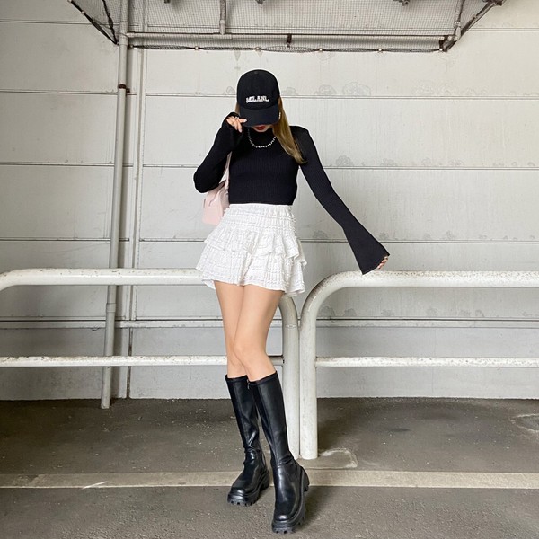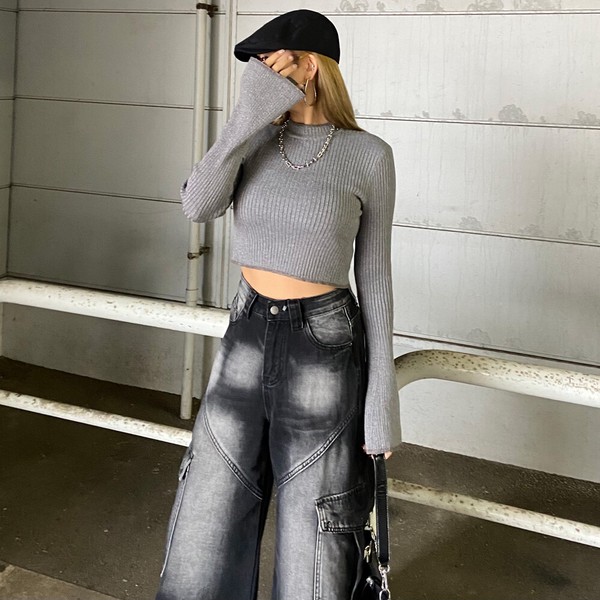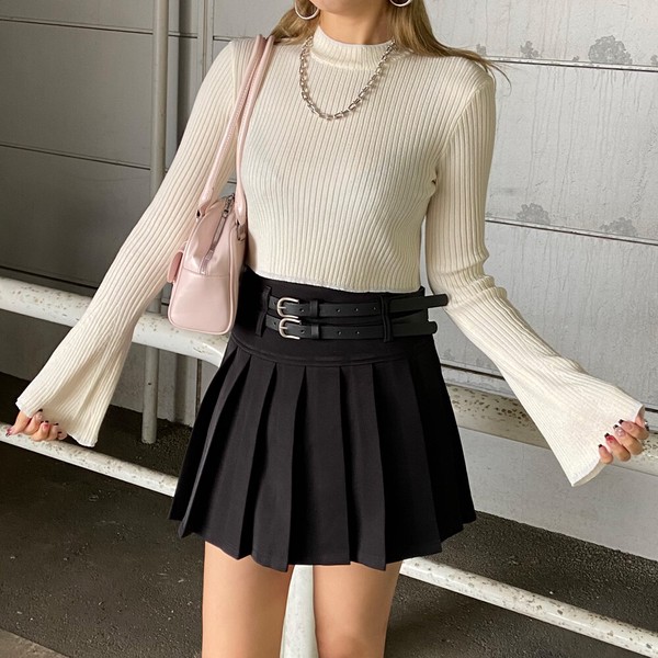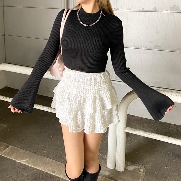 【2026新作】ラメ袖フレアニットトップス ラメニット ハイネック リブニット ショート丈 春ニット