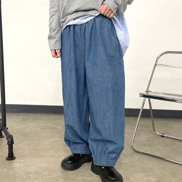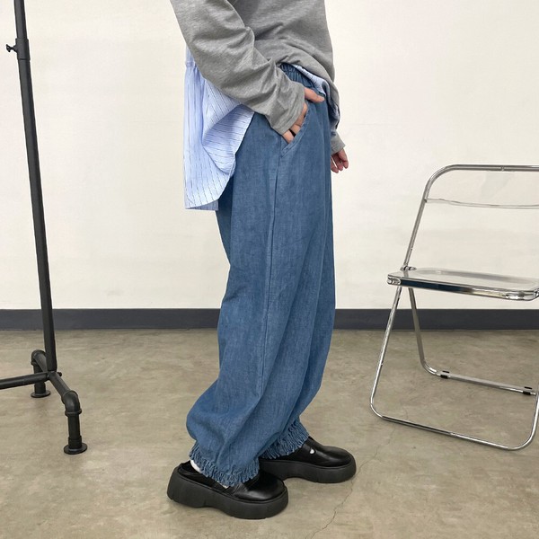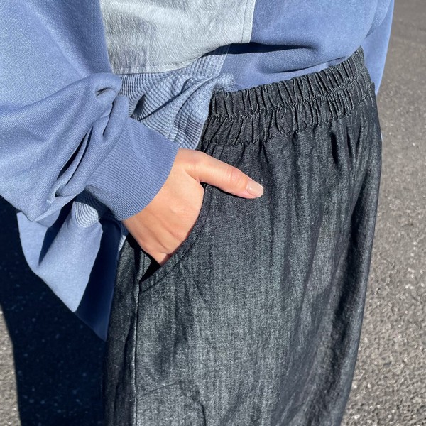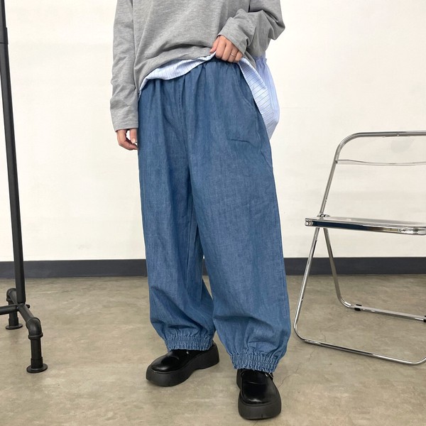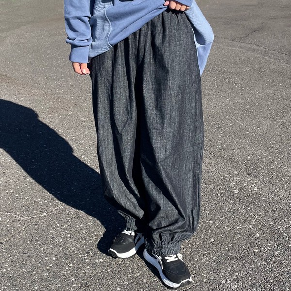 【2026新作】デニム裾スモッキングパンツ ロング ワイド イージー 春 夏 秋 冬 ゆったり