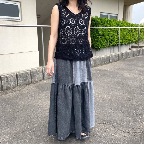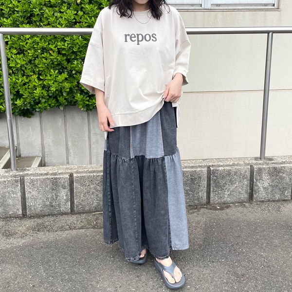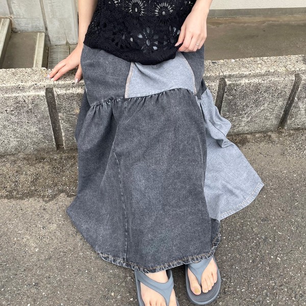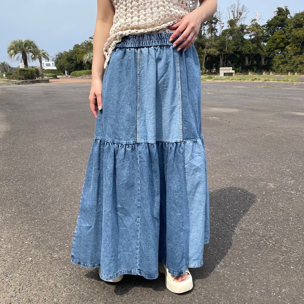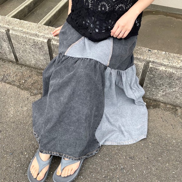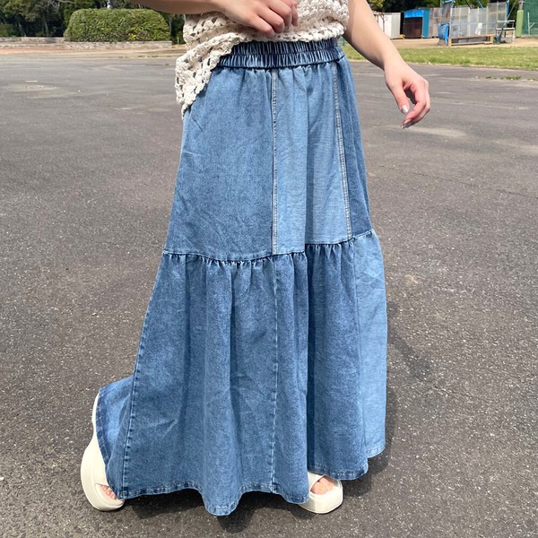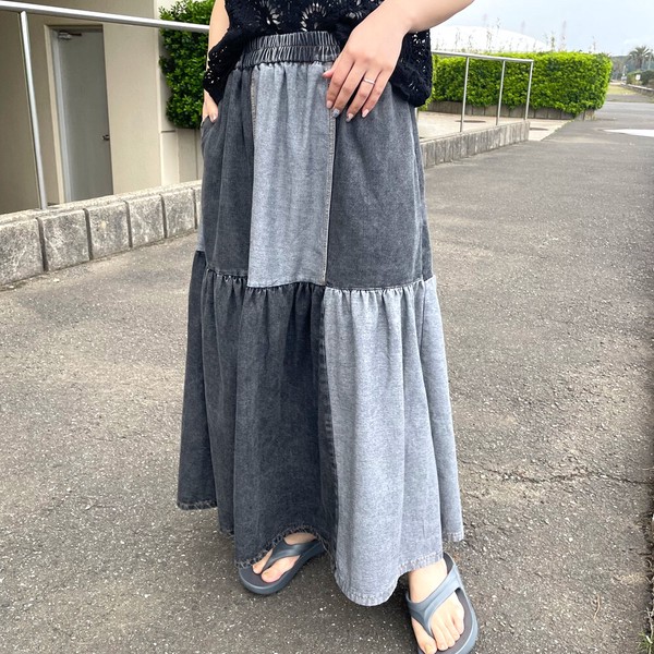 【2026新作】デニム配色スカート フレア ロング ワイド ゆったり 体型カバー 大人 ナチュラル